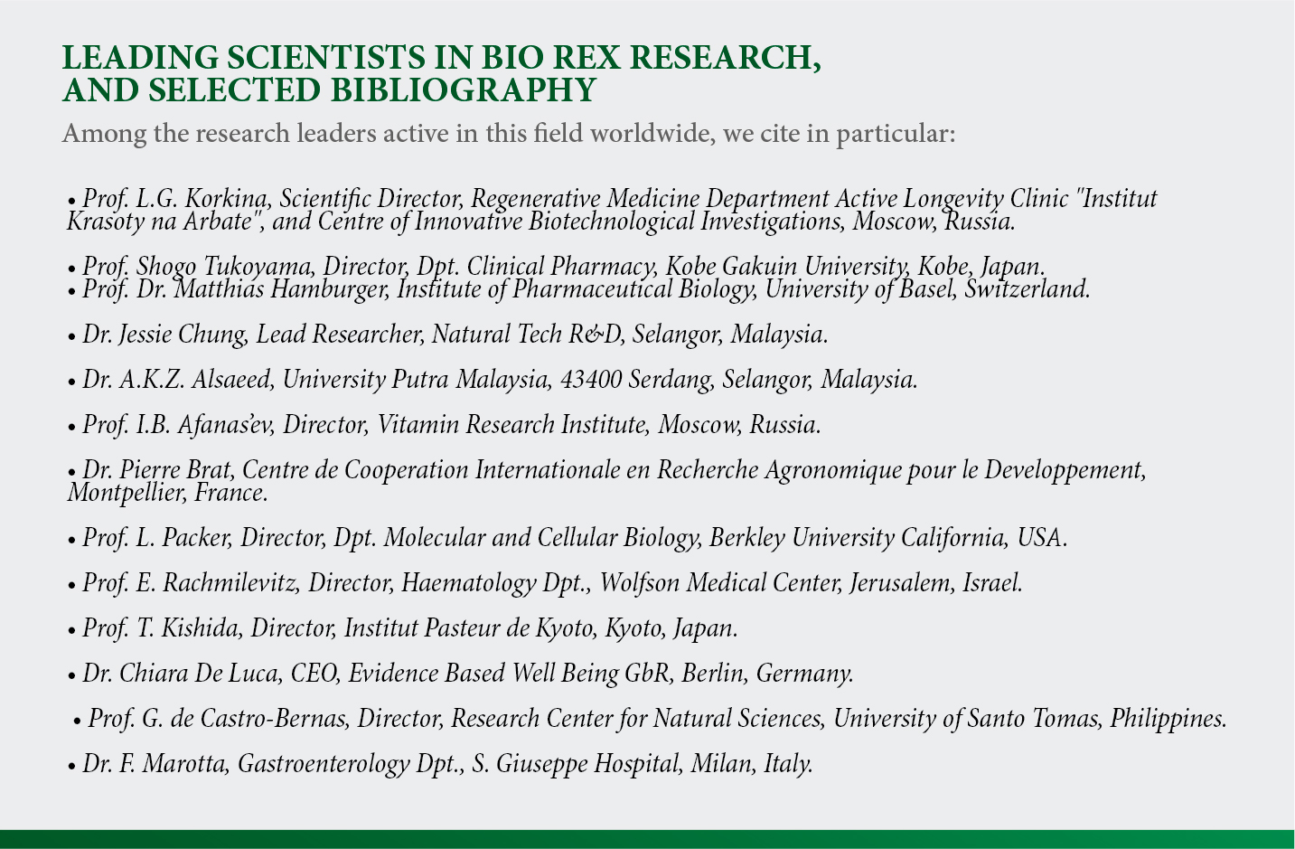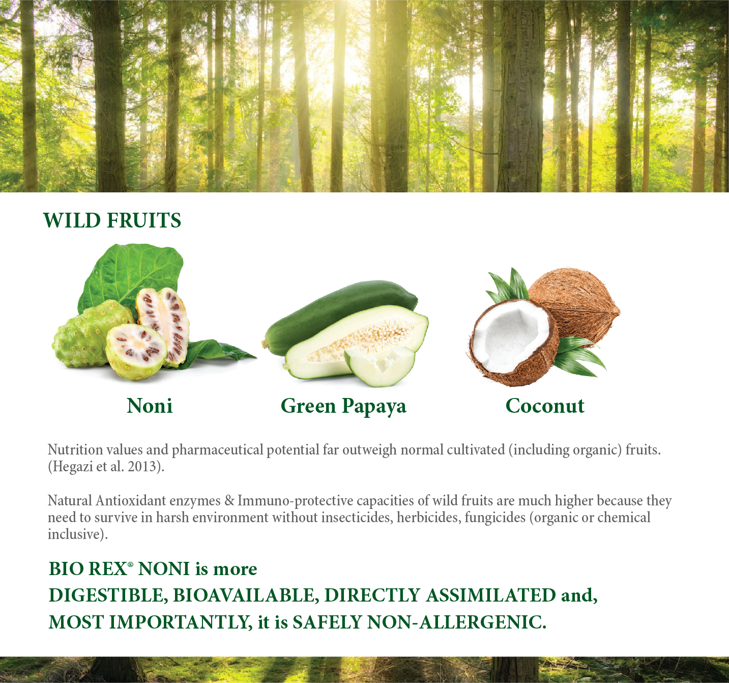 BioRex is made from wild, non-cultivated, non-GMO tropical fruits traditionally used in Southeast Asian ethnopharmacology. Sourced from pristine mountain regions of Quezon Island, Philippines, young green papaya (fruit, seeds, skin, and flowers) is blended with unripe pineapple and mango, then transformed through an innovative, long-term natural fermentation process.